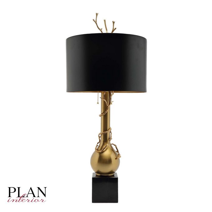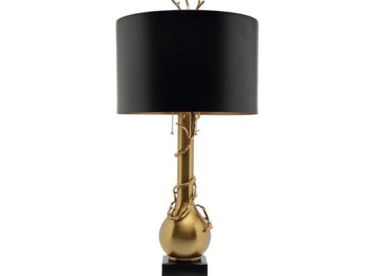 تتميز هذه الأباجورة بتصميم فاخر يمزج بين اللون الذهبي الملكي للقاعدة المزينة بتفاصيل فنية على شكل غصون، مع مظلة سوداء أنيقة تمنح المكان إضاءة دافئة ولمسة عصرية راقية.